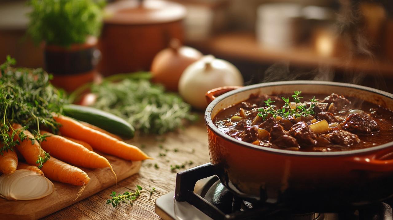 Los detalles finales marcan la diferencia entre un guiso casero y una auténtica experiencia gastronómica. Un toque generoso de perejil fresco picado sobre el plato ya servido añade color, frescura y un contraste aromático que despierta los sentidos. La presentación también importa: servir el Boeuf Bourguignon en una fuente de hierro fundido directamente desde el horno hasta la mesa crea un impacto visual y conserva el calor durante más tiempo. Algunos chefs recomiendan dejar reposar el guiso unos minutos antes de servir, permitiendo que los jugos se redistribuyan y que la temperatura baje ligeramente para apreciar mejor los matices de sabor. Acompañar la comida con el mismo vino utilizado en la preparación cierra el círculo y honra la tradición borgoñesa. Este plato, transmitido de generación en generación, es un verdadero secreto de la cocina francesa que invita a desacelerar, a compartir en torno a la mesa y a redescubrir el placer de comer con calma. Cada cucharada es un viaje sensorial que transporta a los comensales a las colinas de Borgoña, donde la tradición y el sabor se encuentran en perfecta armonía.